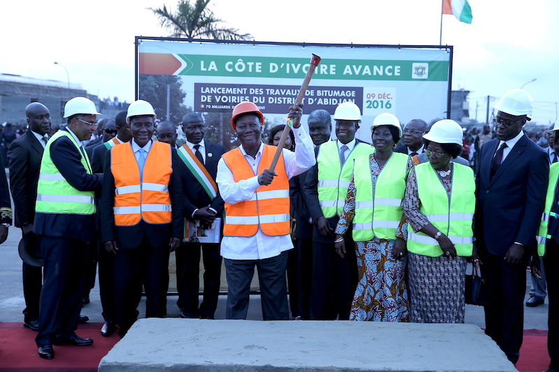 Le Président de la République, S.E.M. Alassane OUATTARA, a procédé, ce vendredi 09 décembre 2016, à Abobo, au lancement des travaux de bitumage de voiries du District d’Abidjan. Intervenant à cette occasion, le Chef de l’Etat a exprimé sa gratitude aux populations d’Abobo pour leur engagement et leur soutien constant à sa personne et à ses actions. Il a promis de mettre en place un plan spécial, ‘’le plan ADO pour Abobo’’, afin d’apporter une réponse adéquate aux besoins de cette commune dans tous les domaines, notamment celui des infrastructures. Abordant le vaste programme de réhabilitation et de développement des voiries du district d’Abidjan, le Président de la République a indiqué que ce programme permettra non seulement de soulager les populations, mais aussi de créer des emplois, notamment pour celles d’Abobo. En matière de routes, ce sont plus de 70 milliards de F CFA de travaux qui seront financés, selon lui, au cours des trois prochaines années pour redonner au District d’Abidjan son lustre d’antan. La première phase de ce projet, a-t-il ajouté, concerne le bitumage de 20 km de voiries dans la commune d’Abobo, pour un montant d’environ 13 milliards de F CFA ainsi que le bitumage de voiries dans les communes de Yopougon et de Koumassi. D’autres projets structurants tels que la construction d’une voie autoroutière qui ira depuis la zone industrielle en passant par la prison civile, N’dotré, le corridor d’Anyama jusqu’à Thomasset et la section d’autoroute de contournement de la ville d’Abidjan depuis le Boulevard Mitterrand jusqu’au carrefour de N’dotré, comme une 2/2 ceinture circulaire autour d’Abobo, permettront de désenclaver Abobo, a souligné le Chef de l’Etat. De même, d’autres communes telles que Adjamé seront concernées par ce programme de réhabilitation et de développement des voiries, a-t-il annoncé. Par ailleurs, avec l’échangeur du carrefour SOLIBRA qui vient d’être lancé il y a quelques jours, l’aménagement de la Baie de Cocody, l’élargissement du Boulevard de Marseille, le pont Yopougon-Plateau, les sections autoroutières de contournement, les échangeurs et d’autres ouvrages dans les autres communes de la ville, le Président Alassane OUATTARA a révélé que ce sont plus de 1000 milliards de F CFA qui seront investis au cours des 3 prochaines années dans le District d’Abidjan. Evoquant les difficultés en matière d’approvisionnement en eau potable du fait des problèmes liés au réseau de canalisations vétustes, quelques fois sous dimensionnées et souvent endommagées, le Chef de l’Etat a annoncé des travaux de réhabilitation des canalisations endommagées qui permettront de résoudre ce problème au plus tard en juin 2017. Abordant les élections législatives du 18 décembre prochain, il a demandé aux populations de voter massivement les candidats du RHDP afin de lui permettre d’avoir une majorité solide à l’Assemblée Nationale devant le soutenir pour faire avancer les différents projets énumérés. Pour terminer, le Président de la République a réitéré sa volonté d’œuvrer pour l’amélioration du quotidien de chaque Ivoirien et de faire en sorte que la Côte d’Ivoire continue d’être un pays modèle et admiré. Avant le Président de la République, le Ministre du Pétrole et de l’Energie, M. Adama TOUNGARA, Maire de la Commune d’Abobo, le Ministre auprès du Président de la République, chargé des Jeux de la Francophonie, Gouverneur du District Autonome d’Abidjan, M. Robert Beugré MAMBE, et le Ministre des Infrastructures Economiques, M. Patrick ACHI sont intervenus pour saluer les actions de développement du chef de l’Etat. Notons qu’au terme des allocutions, le Président de la République a procédé au lancement des travaux de bitumage de voiries à travers un coup de pioche symbolique.