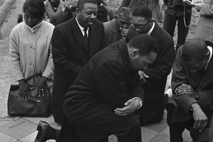 Martin Luther King fit ce geste en 1965 à Selma (Alabama), lors d’une des marches pour le droit de vote des Afro-Américains, juste avant d’être arrêté par la police. « Il prie alors avec quelques-uns de ses camarades, genou au sol », décrit l’historien. « Ce geste de prière a été rapidement interprété comme le symbole de la non-violence. Il s’agissait pour le pasteur Martin Luther King de prendre à témoin les Blancs de sa soumission en tant que Noir ».